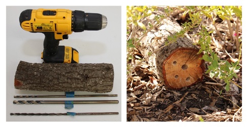 To create these natural bee nesting sites, you will need a drill and several long drill bits of varying diameters (1/4", 5/16", and 3/8"). The size of the hole will determine which species of bees will use it, so it is important to have a range of sizes. To help gauge the depth, place a piece of tape on each drill bit at the 6.5" mark. Carefully drill a few holes that are at least 6 inches deep (preferably deeper) in sections of cut limbs, making sure to vary the diameters. Once the holes are drilled, scatter these sections throughout your landscape. Over time, the wood will naturally decompose, providing a safe and sustainable nesting site for native bees while reducing the risk of disease and parasites.