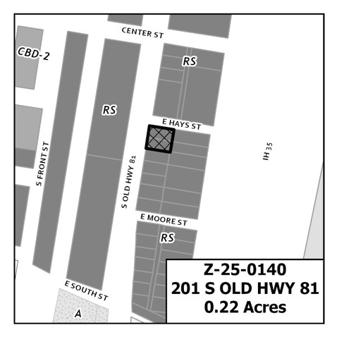The City of Kyle shall consider a request by Nila Gavarrete, (Z-25-0140) to rezone approximately 0.2174 acres of land from ‘RS’ (Retail Service District) to ‘CBD-2’ (Central Business District-2) for Lots 8 & 9, Block B, of the Original Town of Kyle Subdivision, located at 201 & 202 S. Old Hwy 81 in Hays County, Texas.