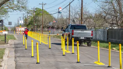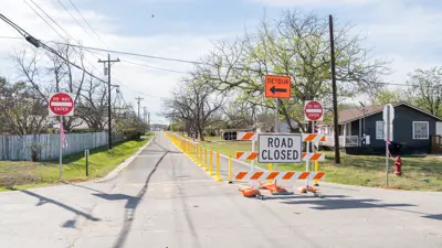 Phase One provided an interim safety improvement. Approximately 800 feet of Blanco Street shifted to one-way eastbound traffic from Veterans Drive toward North Meyer Street, creating space for a temporary protected pedestrian path near Kyle Elementary School.