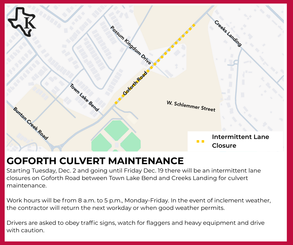 The City of Kyle provides traffic notices to keep residents and visitors informed about road work, closures, detours, and other activities that may affect travel. Each notice includes details about the project, anticipated impacts on drivers and pedestrians, and schedule updates as work progresses. Check this page regularly to stay aware of changing conditions and plan your routes safely.