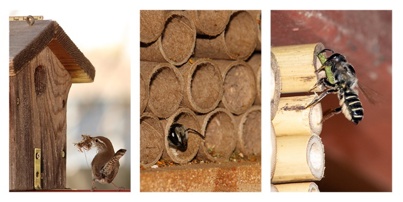 Artificial nest structures, such as birdhouses (left) or bee tubes (middle and right) require ongoing care and attention to ensure they don’t inadvertently encourage disease, attract predators, or harbor parasites.