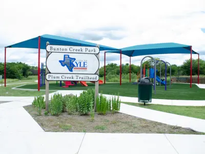 Bunton Creek Park includes a shaded playground, 0.9-mile loop trail, and connection to Plum Creek Trail. This park emphasizes environmental programming through elements like the wildflower meadow, educational signage, and bat boxes. A combination of paved and informal paths connect Bunton Creek and Waterleaf Parks.